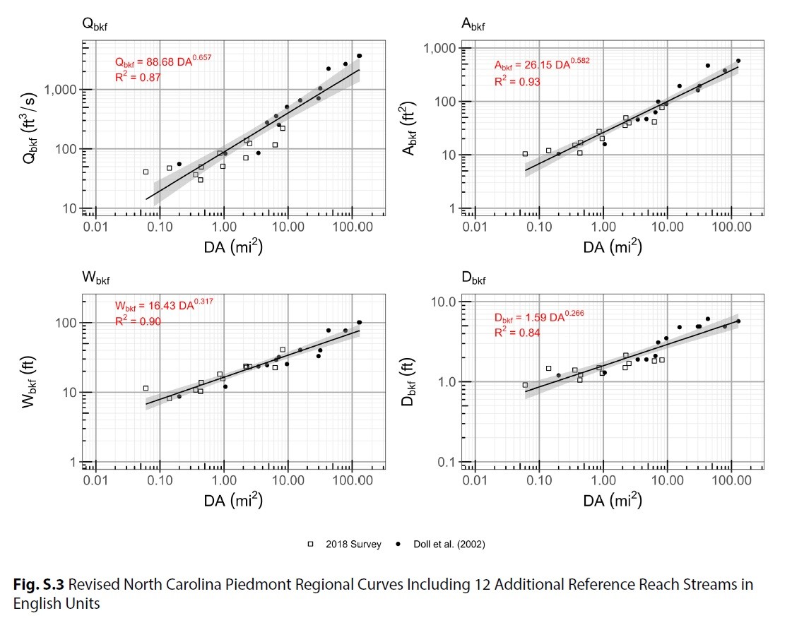 - Published Regional Curves: Peer-reviewed data sets specific to an ecoregion that include hydraulic geometry relationships for bankfull discharge (QBKF), area (ABKF), width (WBKF) and depth (DBKF) [Figure 2].