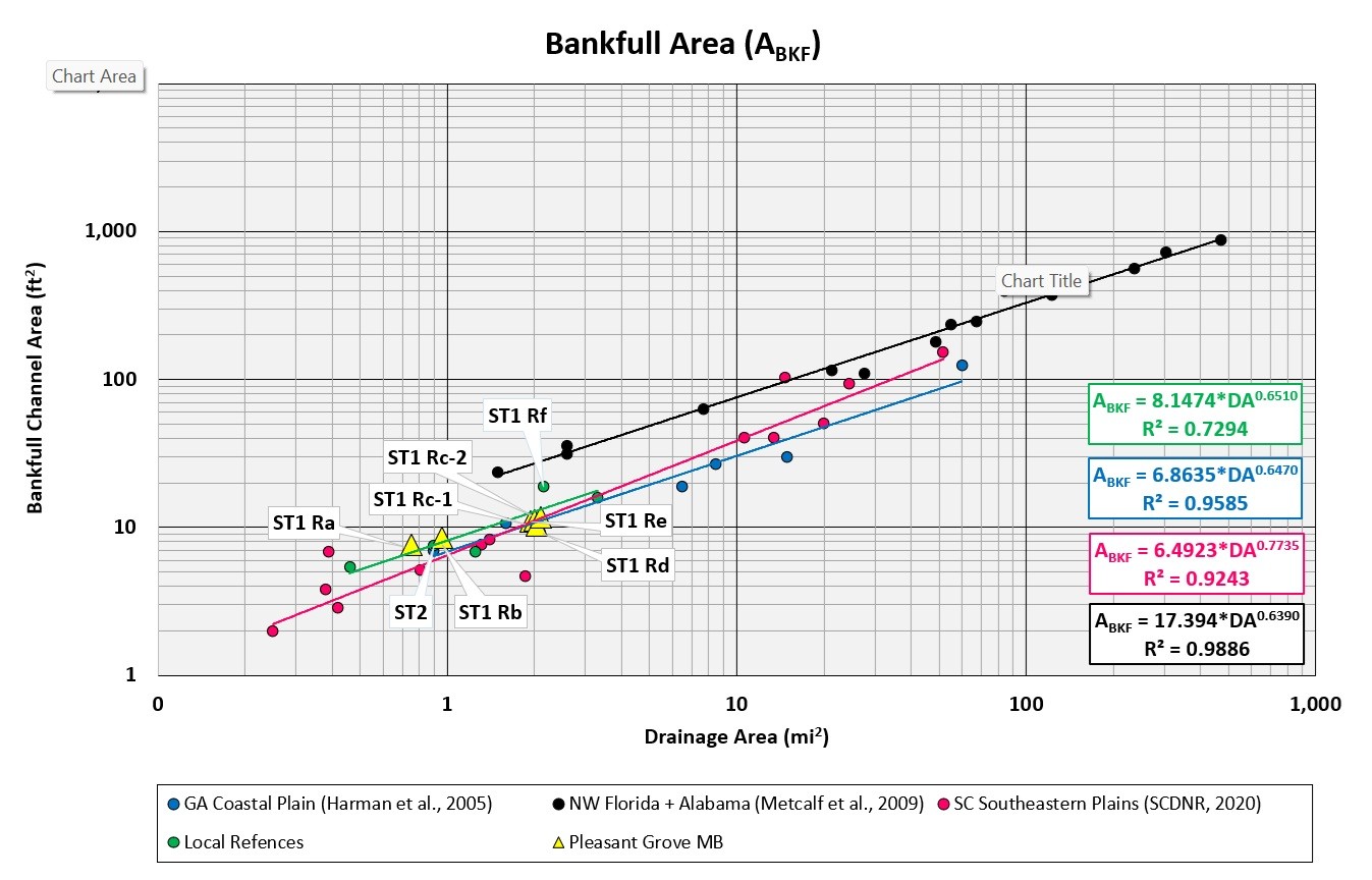 For our work within on a recent stream and wetland mitigation bank in Georgia, we didn't look far to find our design template. We identified and surveyed two onsite reference reaches that were proposed for preservation and located immediately upstream and downstream of our design streams [Figure 4]. By anchoring our design in these local benchmarks, we were able to study and evaluate the sediment supply and transport regimes, hydraulic characteristics, and develop target morphological design criteria that are appropriate for the valley. We validated these findings with publicly available regional curves for the Southeastern Plains and used survey data from our internal database to construct a local or “mini” reference curve [Figure 5].